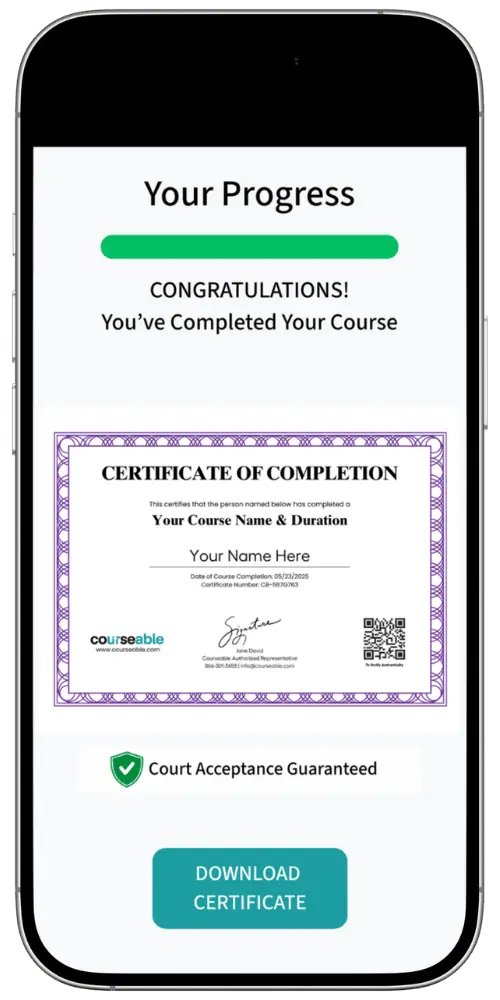 Complete a final quiz covering all course material. A passing score earns your court-accepted Certificate of Completion, available for instant download.